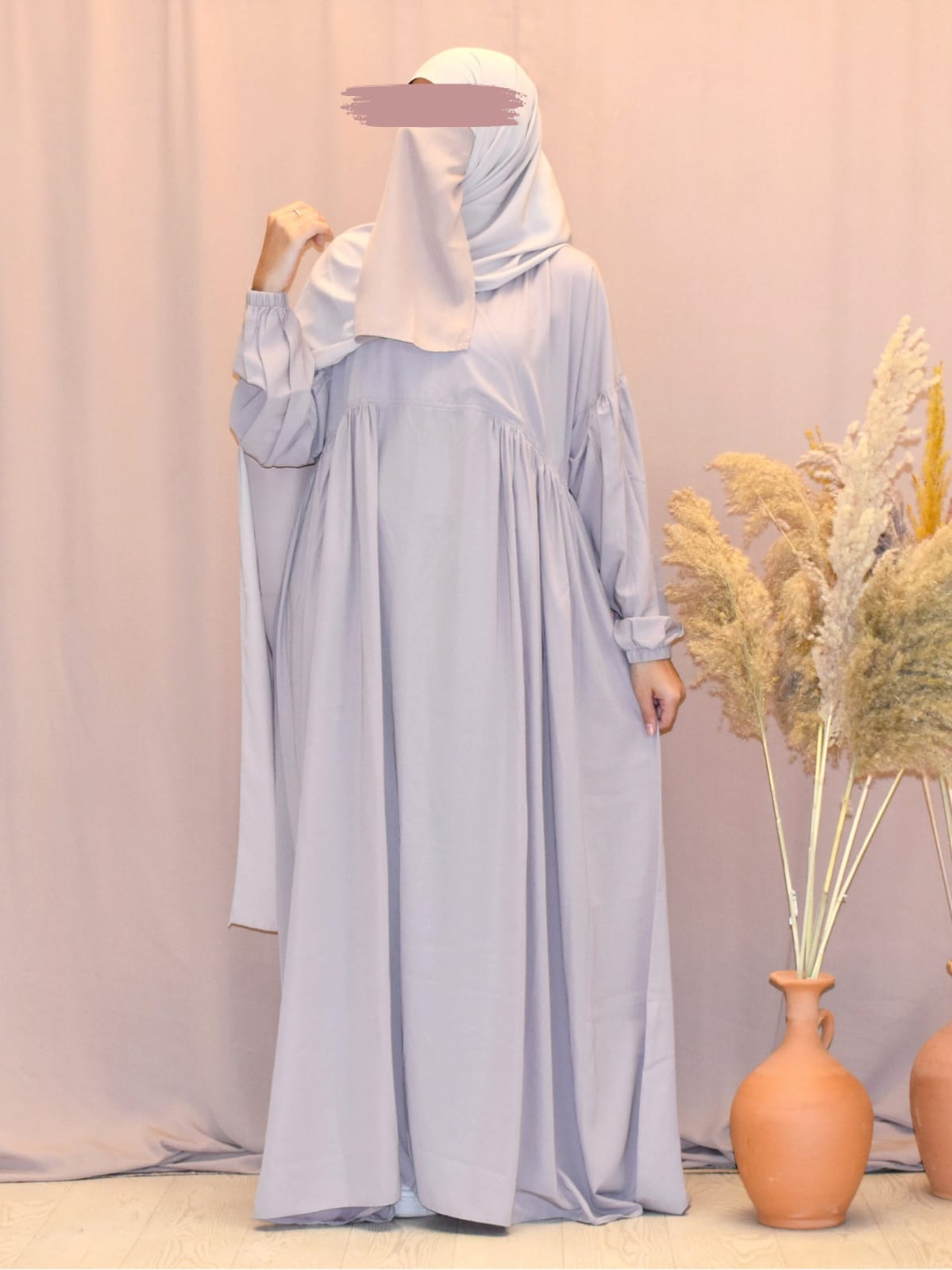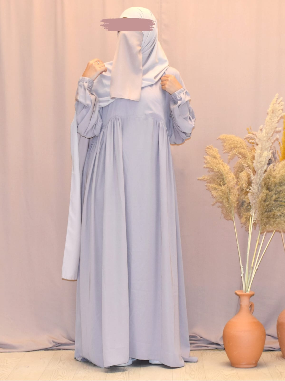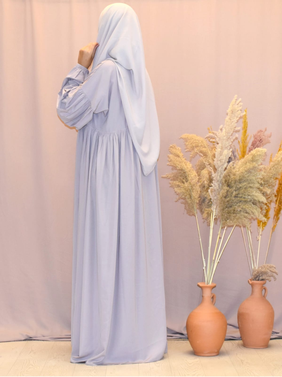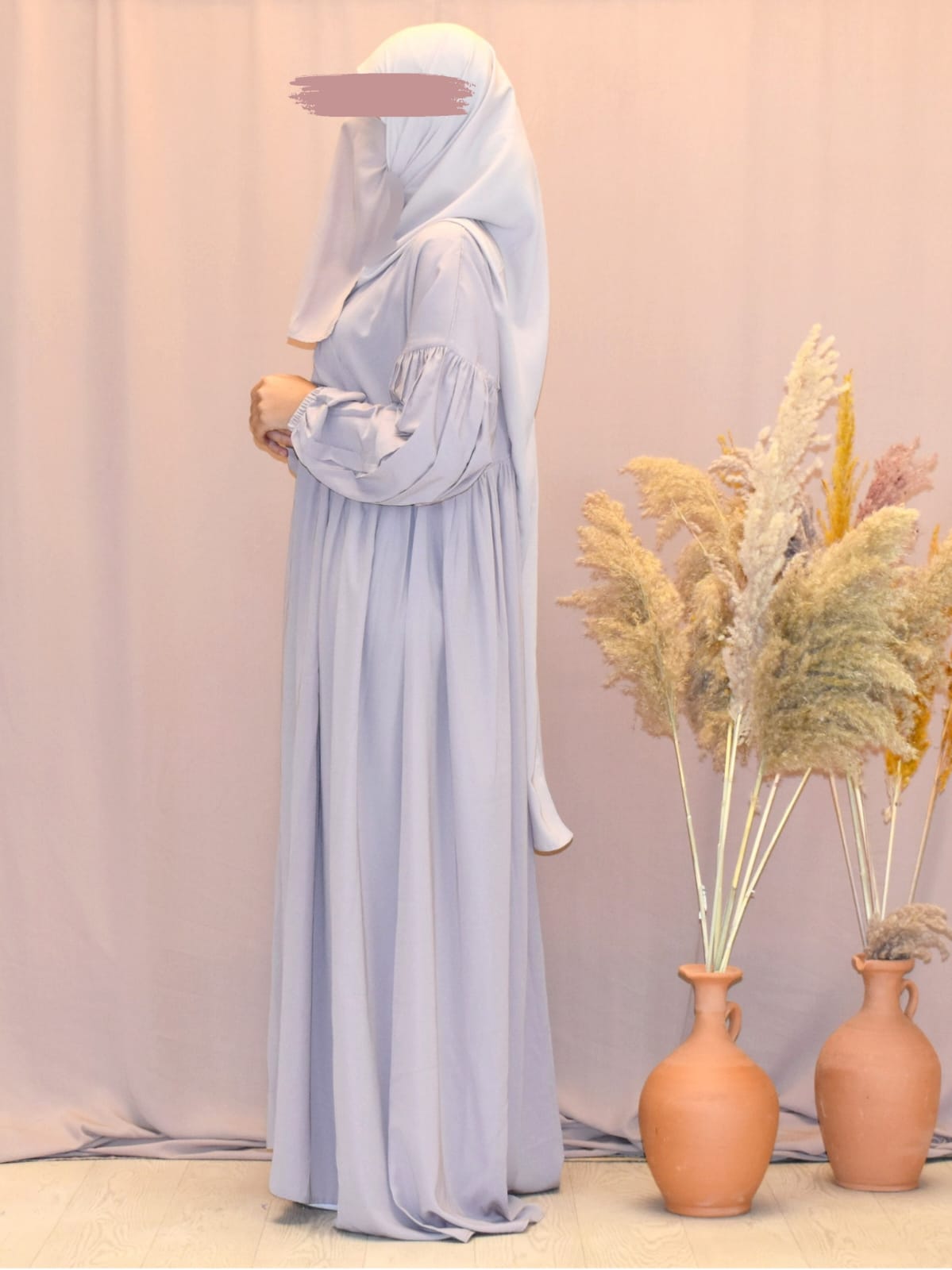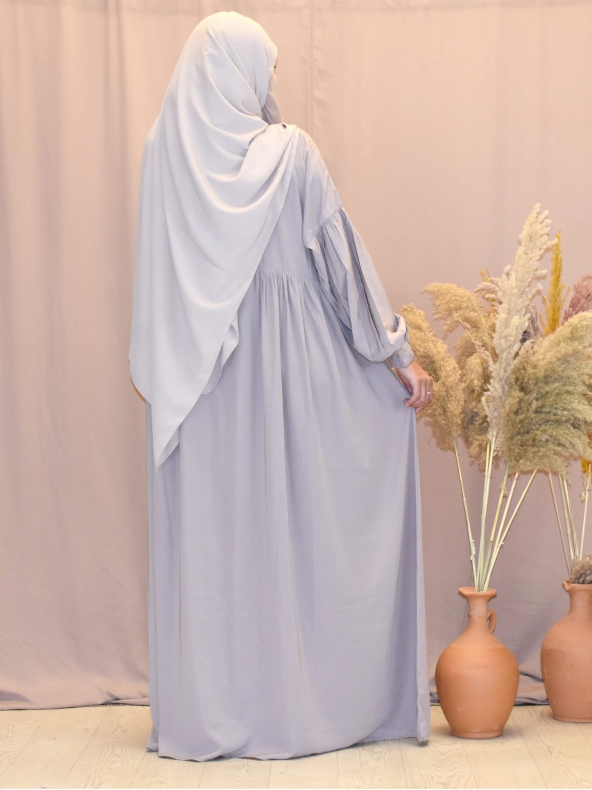 Ses manches bouffantes amples offrent une grande liberté de mouvement et peuvent être facilement relevées pour les ablutions. La jupe évasée présente des fronces discrètes sur les côtés, pour une touche de volume tout en finesse. Son haut cache-cœur est idéal pour l’allaitement, tout en garantissant confort et pudeur.